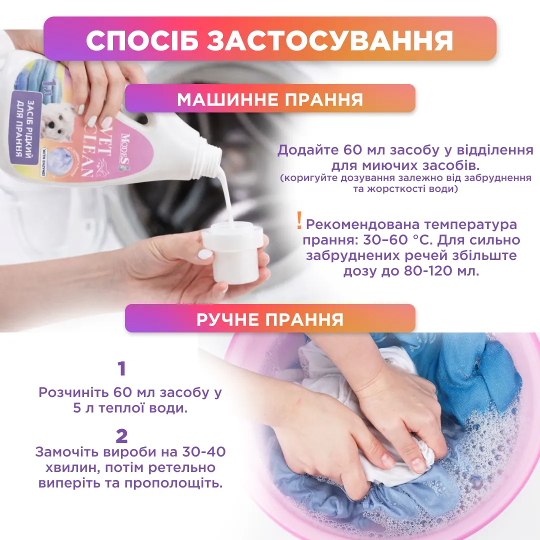 Щоб користуватися VET CLEAN не потрібно ні складних схем, ні «магії» інструкцій, зате результат завжди буде передбачувано відмінним. Крім того, засіб підходить для прання в будь-якому варіанті — у пральній машині або руками.