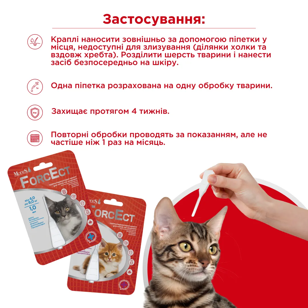 Дозування має значення. Занадто маленька доза не буде ефективною, занадто велика може бути небезпечною. Тому завжди використовуйте препарат відповідно до ваги вашого котика чи кошеняти. ФорсЕкт (ForcEct) випускається двох видів: для котів та кошенят від 0,5 до 4 кг і від 4 до 8 кг.
