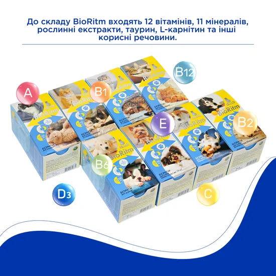 Полівітамінний комплекс для котів і кошенят, створений для корекції обміну речовин та профілактики гіповітамінозів. Біоритм розділений на дві формули (2 прийоми на день) - «Ранок» і «Вечір», які розроблені з урахуванням біологічної потреби організму тварини, а також відповідно до рекомендацій по роздільному і спільному прийому корисних речовин.