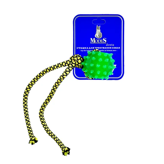 Мʼяч ModeS Denta виготовлений з прозорого терморезинопласту, з додаванням флуоресцентного пігменту та ароматизатора ванілі. Безпечні матеріали забезпечують міцність, стійкість до зовнішніх впливів і довговічність виробу. Завдяки спеціальним шипам іграшка масажує ясна та очищує зуби під час гри, допомагаючи запобігати стоматологічним проблемам у собак. Бавовняний канат підходить для активних ігор у перетягування та є безпечним для зубів собаки. Яскраві кольори утримують увагу улюбленця, а водостійкість робить її зручною для ігор не лише вдома, а й на природі.