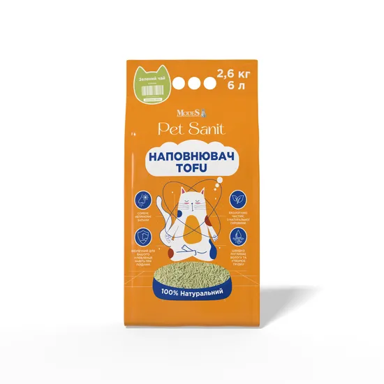 Тофу для котячого лотка — це сучасний рослинний наповнювач, виготовлений з натуральних соєвих волокон, які залишаються після виробництва соєвого сиру. Подрібнені волокна перетворюються на акуратні гранули, які готові взяти на себе найважливішу місію котячого лотка — утримувати запах і вологу. Наповнювач тофу має високу поглинаючу здатність, безпечний склад і яскравий аромат персика, яблука, зеленого чаю або лаванди. У складі наповнювача тофу немає ніякої хімії — це повністю натуральний продукт. Навіть у разі потрапляння невеликої кількості наповнювача в травний тракт він не становить небезпеки для котів, адже повністю біорозкладається і не містить токсинів.