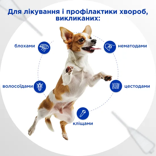 Профілактика та лікування собак при хворобах, спричинених ектопаразитами: блохами (Ctenocephalides canis), волосоїдами (Trichodectes canis); акариформними кліщами (Sarcoptes canis, Otodectes cynotis); тромбідиформними кліщами (Cheyletiella jasguri) та ендопаразитами (гельмінтами): цестодами (Dipylidium caninum, Taenia spp., Echinococcus spp.); нематодами (Toxocara cati, Toxascaris leonina, Ancylostoma tubaeforme, Capillaria plica); профілактика дирофіляріозу (Dirofilariа spp.).