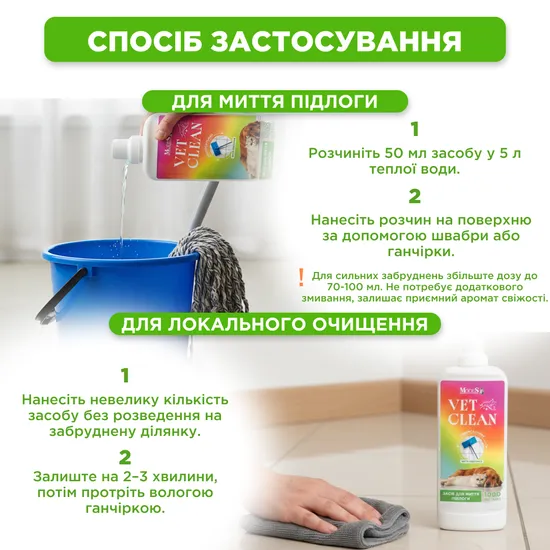 Рідкий універсальний засіб VET CLEAN для миття підлоги, створений для ефективного очищення різних типів поверхонь. Формула містить пробіотичні культури, ензими та антисептики для розщеплення органічних забруднень, антисептичні компоненти для гігієнічної чистоти та м’які ПАР, що не шкодять тваринам.