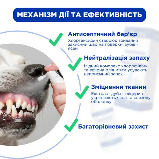 Спрей допомагає підтримувати гігієну ротової порожнини собак і котів, зменшуючи утворення зубного каменю та нальоту, освіжає подих та забезпечує антисептичну дію.