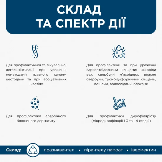 Профілактика дирофіляріозу: Dirofilaria spp. (мікродирофілярії L3 та L4 стадій).Перед застосуванням збовтати!